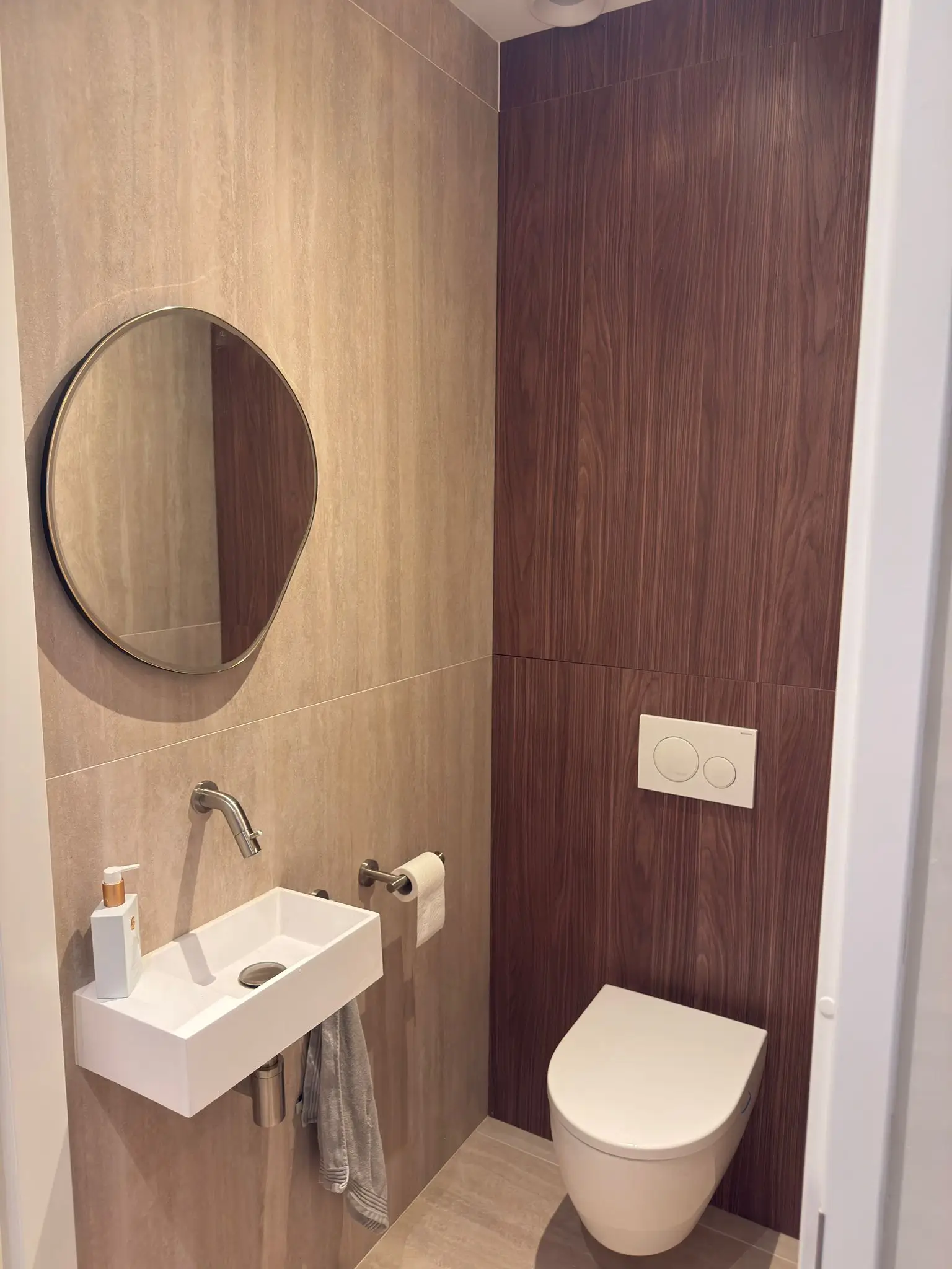 Voor dit project hebben we in Den Haag een toiletruimte volledig vernieuwd met een moderne en warme uitstraling. De klant wilde een compacte maar stijlvolle WC die beter aansluit bij de rest van de woning. Daarom hebben we gekozen voor een combinatie van beige wandtegels en een opvallende wand met houtlook panelen achter het toilet, wat de ruimte een luxe en unieke uitstraling geeft.